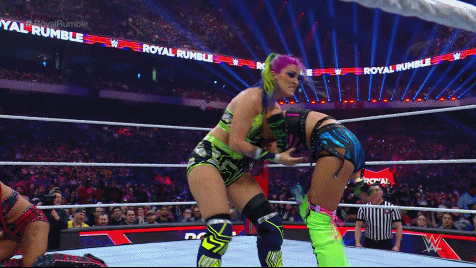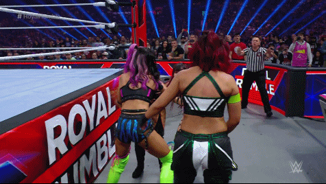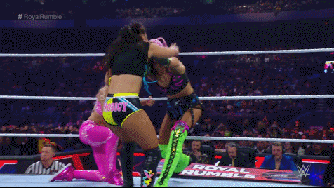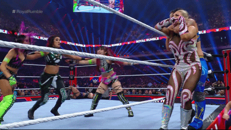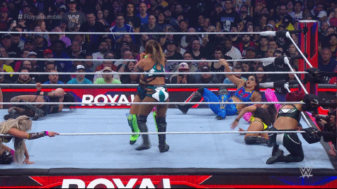 Damage CTRL exited between the ropes and attacked Becky at ringside. Lynch fought off Kai and SKY, meeting up with Bayley in the ring. Bayley tossed Lynch who went through the ropes instead of over. Bayley and SKY smashed Lynch into the barricade before Kai and SKY flung her over the commentary table. Hey, Becks earned herself some frequent fly miles so she should be grateful. Number 16 was Kai's former best friend Tegan Nox. Sadness. Kai found herself under attack by Nox who set her up for a gourdbuster only to nearly crack her head open with a knee strike.