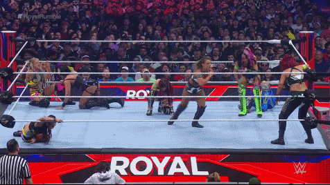 The Ladies got some shots in on Rhea Ripley. Zoey Stark was number 13 and unloaded her fury on The Ladies including a roundhouse kick to Kai. Fortunately, The Ladies regained control unleashing some hell on Liv Morgan and Candice. Speaking of that wretched pixie, IYO eliminated her. One arch-pest was out of the way. Another would enter at number 15. Bitter Time Becky Lynch.
