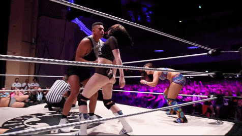 Alex grabbed Nixon intending a tornado DDT. Pollyanna put stop to it, grabbing Alex and launching her so Nixon could drop her with a flatliner. Dahlia grabbed Pollyanna and held her for TK to heinously strike. Pollyanna moved out of the way. TK instead struck his lover Dahlia. Nixon had enough of this nonsense. She kicked TK in the bollocks and flipped him off. With TK out of the way Nixon returned her focus to Dahlia, release tiger suplexing her to the canvas.