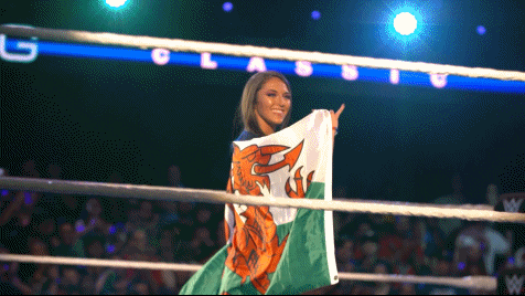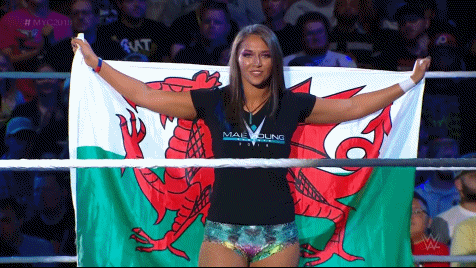 Tegan Nox was ready to compete in the 2018 Mae Young Classic. Prior to the event there was the Parade of Champions where all the competitors were presented to the audience at Full Sail. The Girl With The Shiniest Wizard proudly carried the Flag of Wales to represent her home country. Like a dragon, Tegan Nox was ready to take flight and scorch her way to victory.