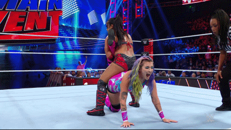 Xia lifted Nox up by the hair only to get rolled up for two. Nox caught a kick and rolled Li up for another two. Xia got walloped with a nasty PK to the chest for two on the cover. Nox was frustrated but didn't waste time, hauling Li up for the gourdbuster. Xia slipped off and clipped Nox at the left knee with a chop block. A running knee flush to the jaw sent Nox to the apron. Xia charged at Tegan once more, striking her hard to the floor. The chop block and crash to the outside had Nox favoring her previously injured left knee.