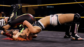 The action returned in-ring where Io taunted Nox crudely pushing her in the face, encouraging her to hit back. Each push got more aggressive, making Nox more angry. She would fire back with a fury of forearms and uppercuts. Nox followed by Irish whipping Shirai to the corner. Io would avoid contact, springing to the middle rope and back at Nox with a crossbody. But Tegan caught Shirai and brought her down to the canvas with a bridging fallaway slam for a two count. Nox charged at Shirai who sent her face first to the bottom turnbuckle with a drop toe hold.