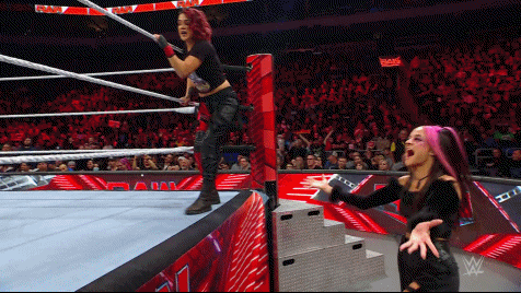 Spirits were lively as Dakota and IYO accompanied Bayley to ringside for her match. Bitter Time Becks put a halt to their united front, forcefully chasing Dakota and IYO from ringside. We all know that The Ladies can successfully handle business on their own... still it's an absence of that familiar friendly motivation. At least some of the crowd was cheering for their Role Model. Still, they can't exactly provide that extra kick of emotional support being present at the apron can. To make things worse for Bayley, her rival Bianca Belair came down to watch the match.
