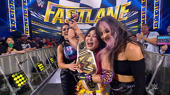 Bayley took advantage of the no disqualification rule, stealing the referee's attention so he didn't see Asuka tapping out to the Figure Eight. IYO came crashing down on Charlotte with Over the Moonsault breaking the hold. Asuka had no fight left in her. IYO covered Charlotte for the 1-2-3. And still your WWE Women's Champion IYO SKY. Bayley grabbed the title and put it around IYO's waist. IYO was overjoyed, grateful in this case that her friend defied her. SKY was all smiles, grabbing Bayley for a hug. Dakota came out for a beautiful group hug in the aisle. Bayley gave IYO's arm The Kiss of Bay.